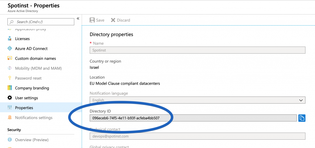 Under your Active Directory's main menu, go to Properties, copy the Directory ID (Tenant ID), and save it.